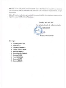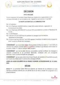 La Haute Autorité de la Communication (HAC), suspend le journaliste André Morel Gaston pour une période de six (6), sur toute l’étendue du territoire national pour faute professionnel. Cette suspension intervient après une interview accordée à un prétendu candidat à Kaloum.