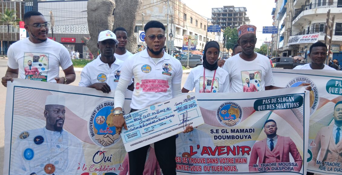 Dans le cadre de la préparation à l’élection présidentielle du 18 décembre prochain, le Mouvement de la Diaspora guinéenne a organisé, ce samedi, 1 Novembre 2025 une marche de soutien devant le Palais M5. Objectif : exprimer son appui à la candidature du Général Mamadi Doumbouya et remettre symboliquement un chèque de 900 millions de francs guinéens. représentant la caution présidentielle.