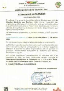 Selon la DGE, toutes les organisations nationales et internationales, ainsi que les observateurs indépendants souhaitant participer aux opérations d’observation électorale, doivent désormais soumettre leurs demandes exclusivement en ligne via le portail : www.observation.dge.gov.gn. La période de dépôt s’étend du 22 novembre au 17 décembre 2025, aucune demande physique ne sera prise en compte.
